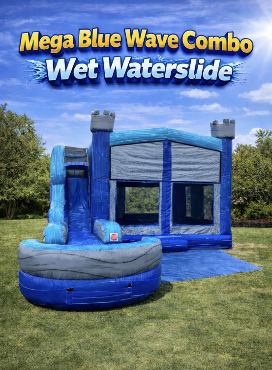 Mega Classic Combo Castle can be used wet or dry. This unit is a must have addition to any event. Compact & multi-functional, this unit includes a jumping area, a basketball hoop, rock climbing step and a wet or dry sliding surface.