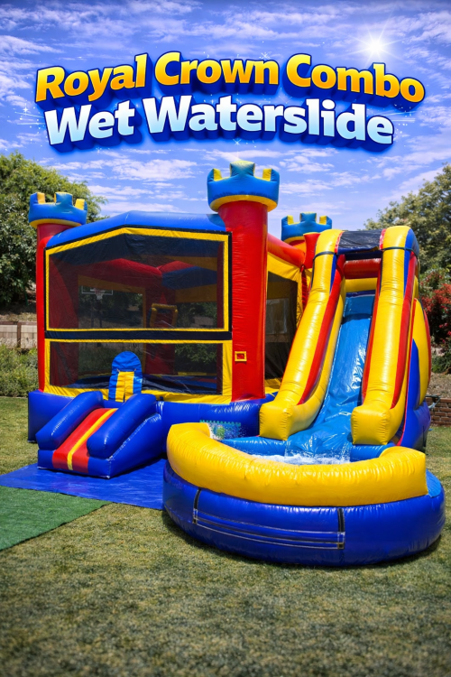 The Royal Crown Castle Combo Jumper with Wet/Dry slide offers a jumping area, basketball hoop & rock climbing steps. This inflatable jumper combo is ideal for backyard parties and recreational event centers. High-visibility mesh around all sides allows spectators to view easily. This unit can be rented wet or dry.